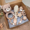 ● Crochet beads and rattle made of cotton yarn filled with cotton wool